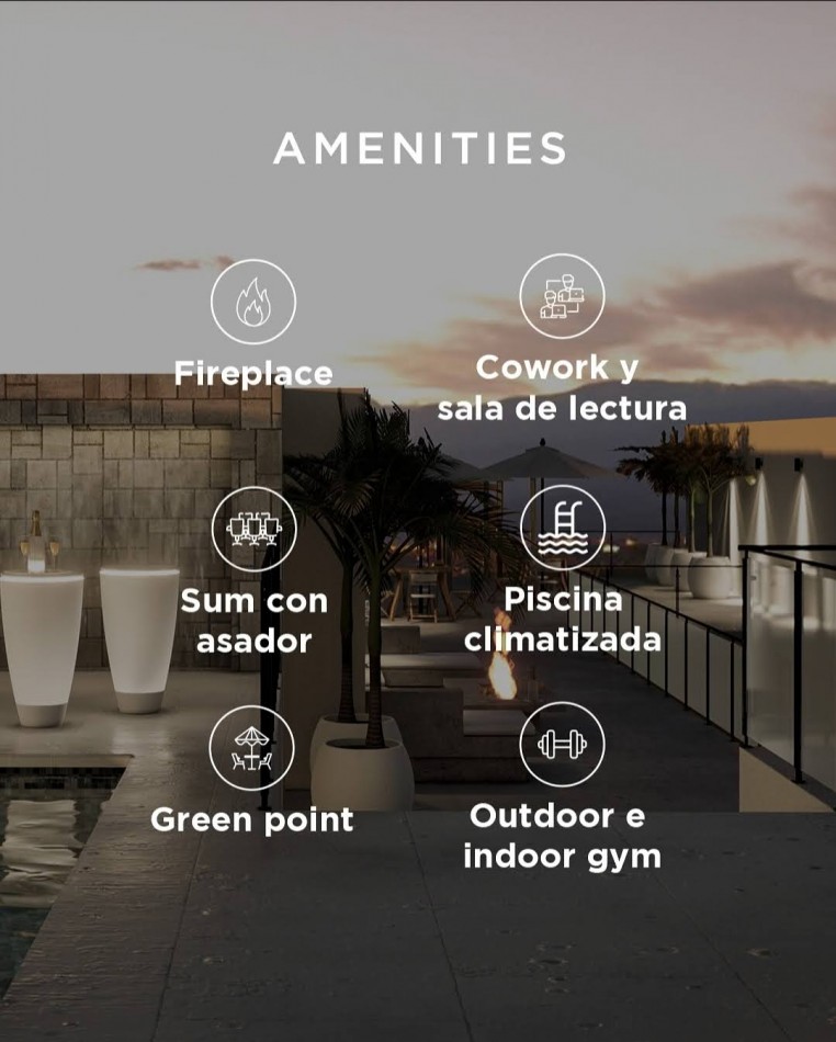 Amenities: Fireplace, outdoor gym, cowork, green point, indoor gym, piscina climatizada, SUM, laundry.
