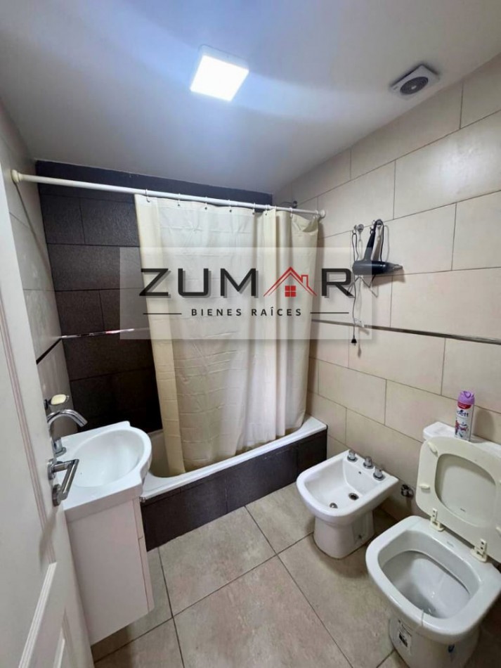 Se encuentra amoblado con cama de 2 plazas, ropero, heladera y lavarropas.